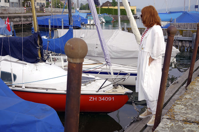 Fotografie napokon vznikli tesne pred odletom domov. Podľa svetla to vyzerá na podvečer, je to však skoré ráno. To chceš letieť v tomto bielom župane?! Raz nevedel rozdýchať Berner. Nechcem. Vyriešim to. Pobrali sme sa ku Zürišskému jazeru aj s kufrom, našťastie železničná stanica je hneď vedľa.