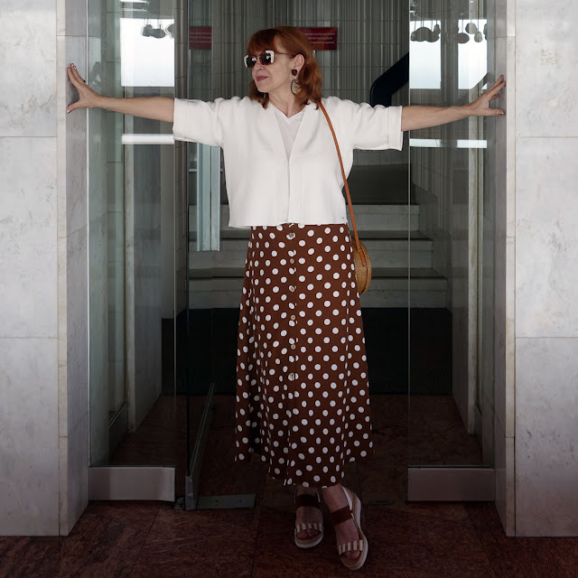 OdstrániťLove the polka dot skirt and this adorable straw circle bag! Lisa